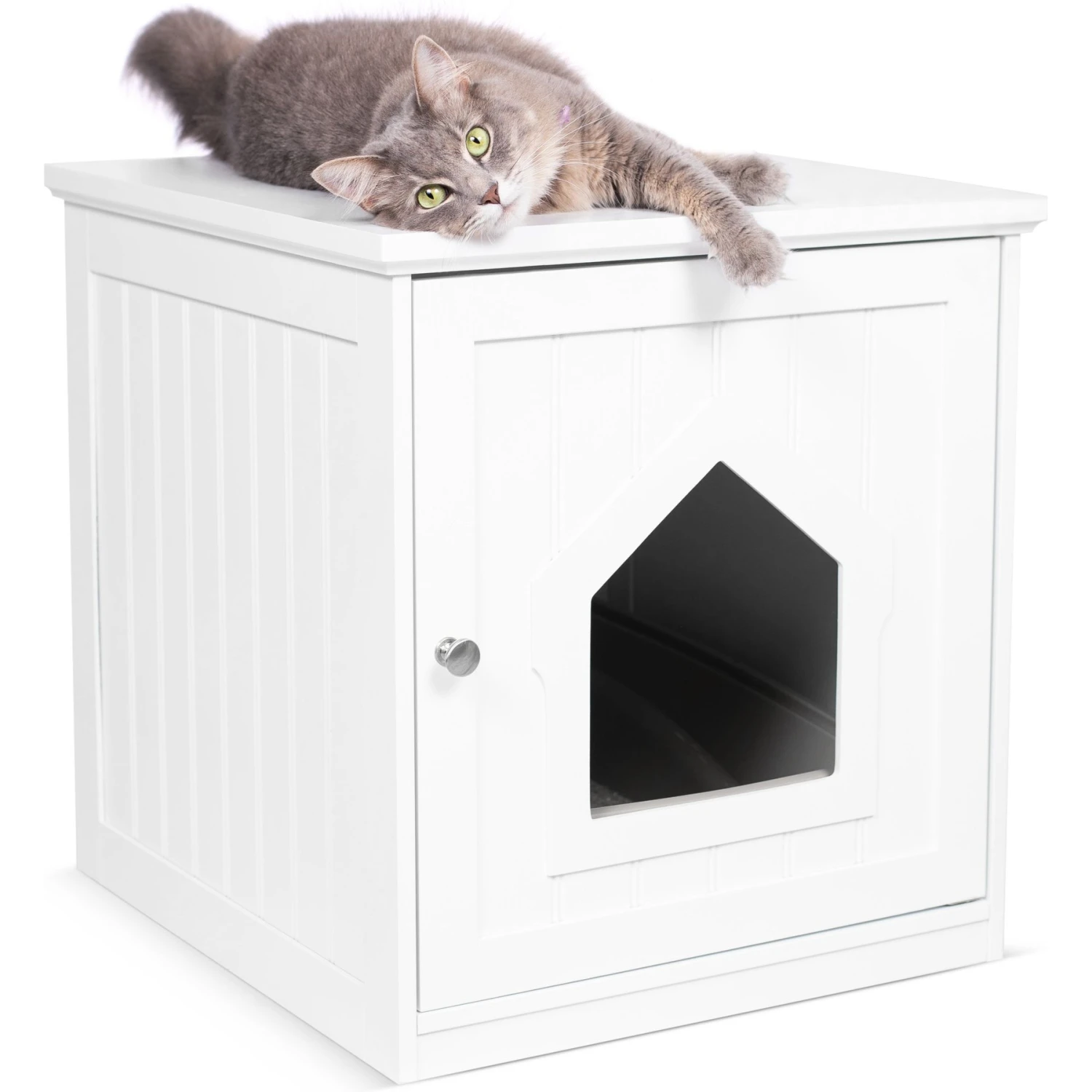 - Decorative cat hole lets your pet come and go as they please, while the hinged door provides easy access for cleanups.
