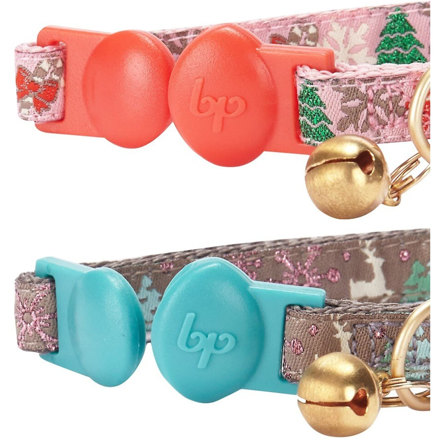 - Two cat collars—one with snowflakes, Christmas trees, gingerbread cookies and candy canes on baby pink background; another with snowflakes, Christmas trees and reindeers on khaki background.