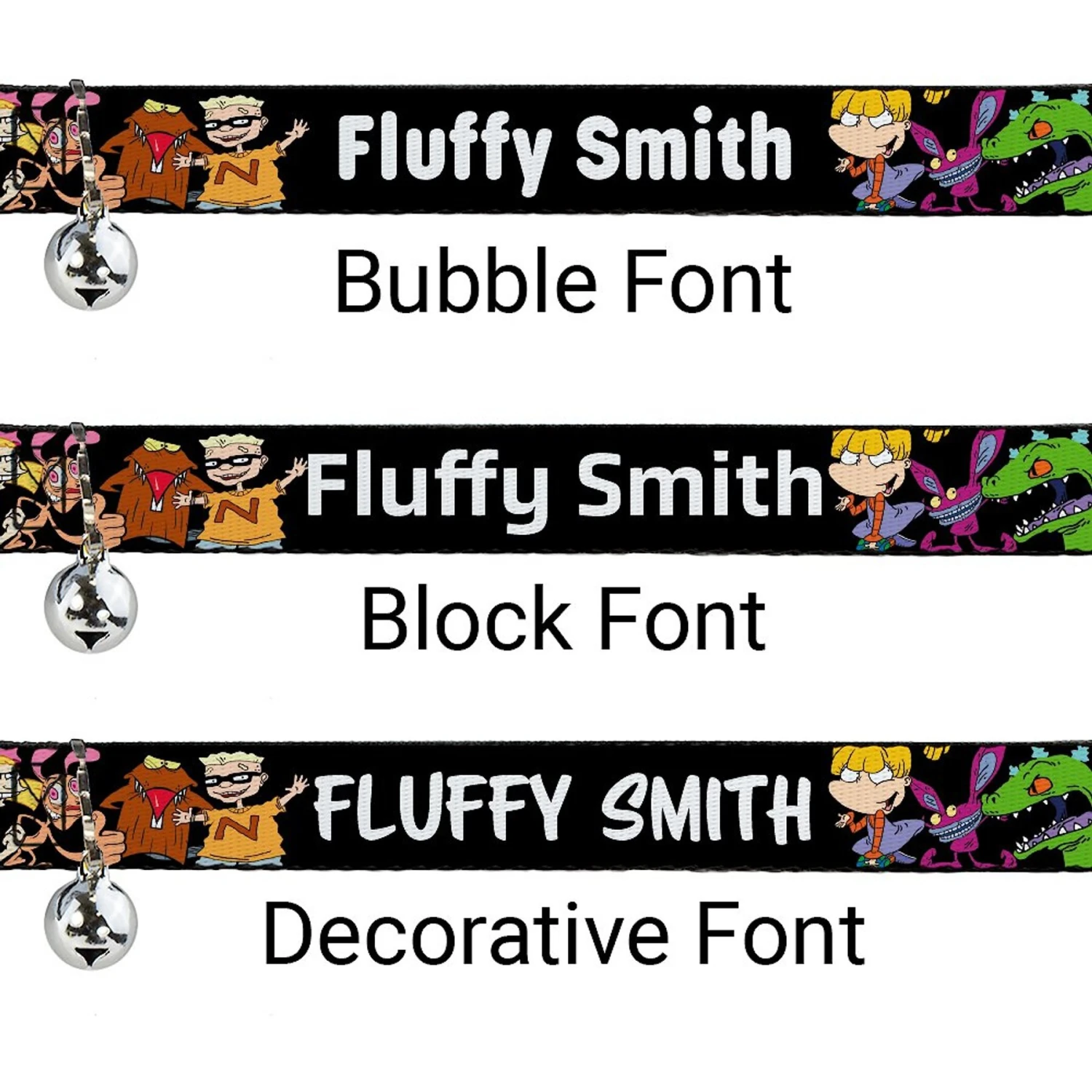 Remember to measure your pet for the paw-fect fit. Show off your love for your favorite characters on your favorite pet with the Buckle-Down Personalized Nick 90’s 13 Breakaway Cat Collar with Bell. Crafted with durable, high-density polyester, a plastic breakaway clip, and a handy bell—this collar is made for the cat on the move with places to go and people to see. Plus, you can get the matching leash (sold separately) for extra flair during those times when you need it!