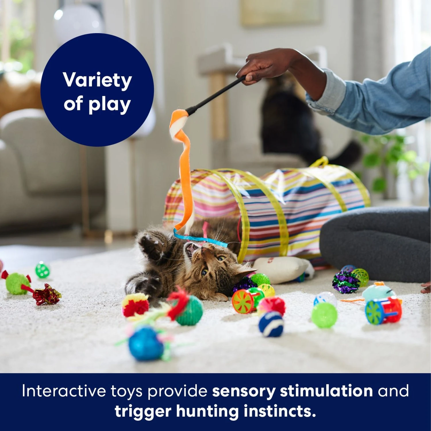 • This eclectic variety of over two dozen different play options features all the classics cats love, including catnip-filled toys, fuzzy mice, crinkly pom-poms, rolling balls, wand, and play tunnel.
