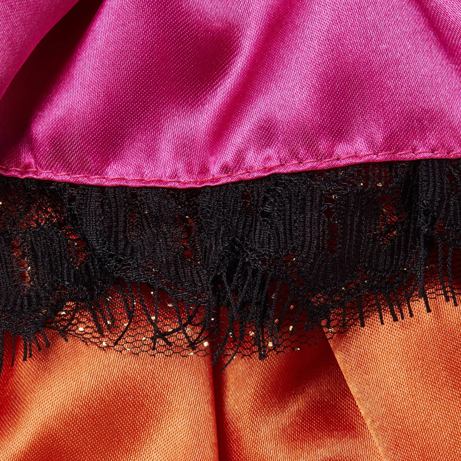 • This Carnivale-inspired dress features multi-colored stripes, black lace detailing, and a matching flower headpiece.