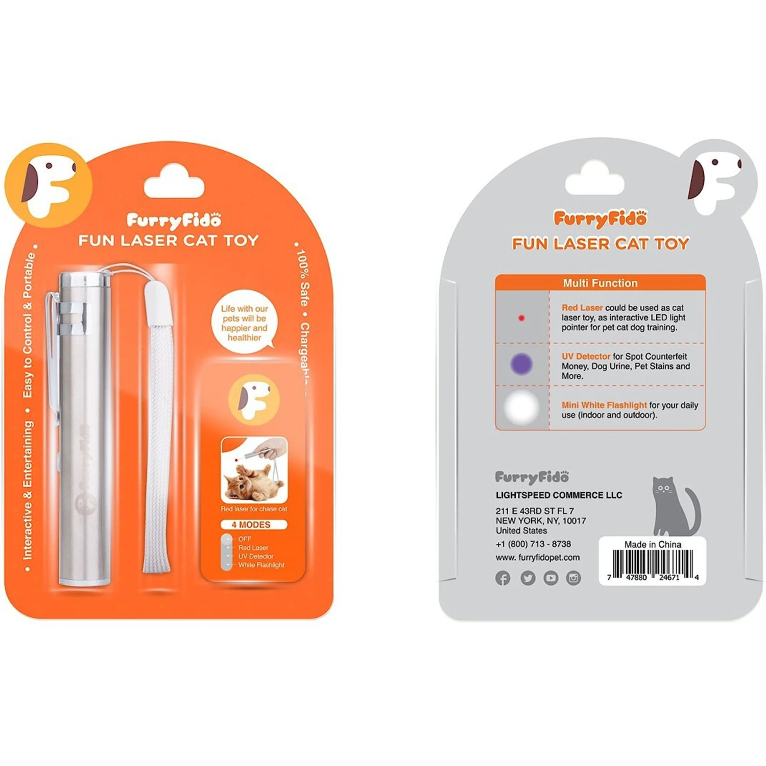 Let there be light! With the FurryFido laser toy, you can start an interactive, action-packed game that effortlessly gets your cat moving—just by pressing a button! Move the laser pointer around the room and watch your kitty run, jump and pounce to capture the illusive dot. The moving point stimulates her inner hunter, activating her natural instinct to chase prey and sending her on a mission that will get her heart pumping. She won’t even know she’s started an exercise regimen! When the fun is done, plug the included USB into any socket or computer to recharge. Plus, with UV detector and flashlight modes, this laser is more than just a simple toy. Use the UV light to check for pet urine around your home, or switch to the white flashlight to look for that tennis ball that rolled under the couch. It’s made with a high-quality stainless-steel finish, and completely portable. With a multi-function device like this, the opportunities are limitless.