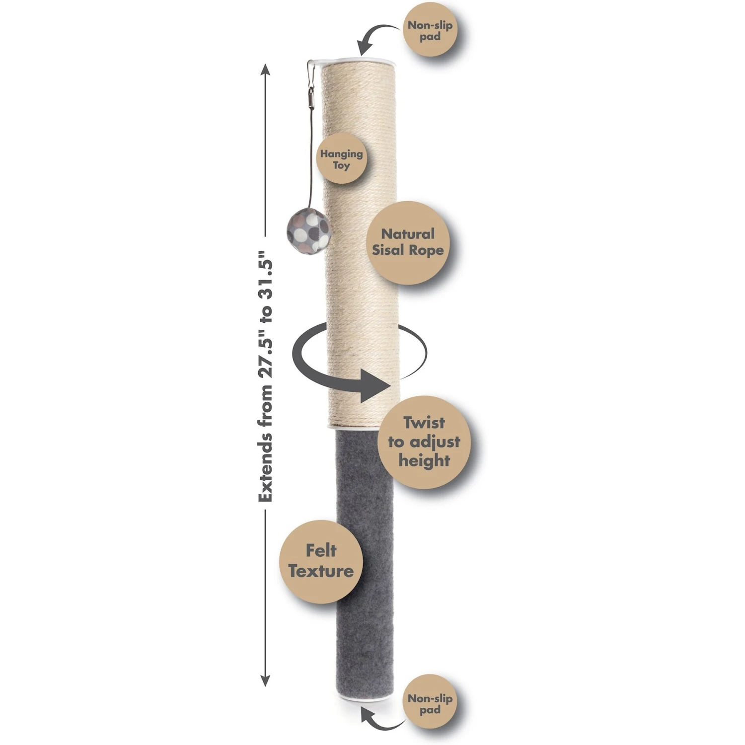 - Designed with natural sisal and soft felt scratching surfaces that cats love. Plus, the included hanging toy entices your feline to play and scratch.