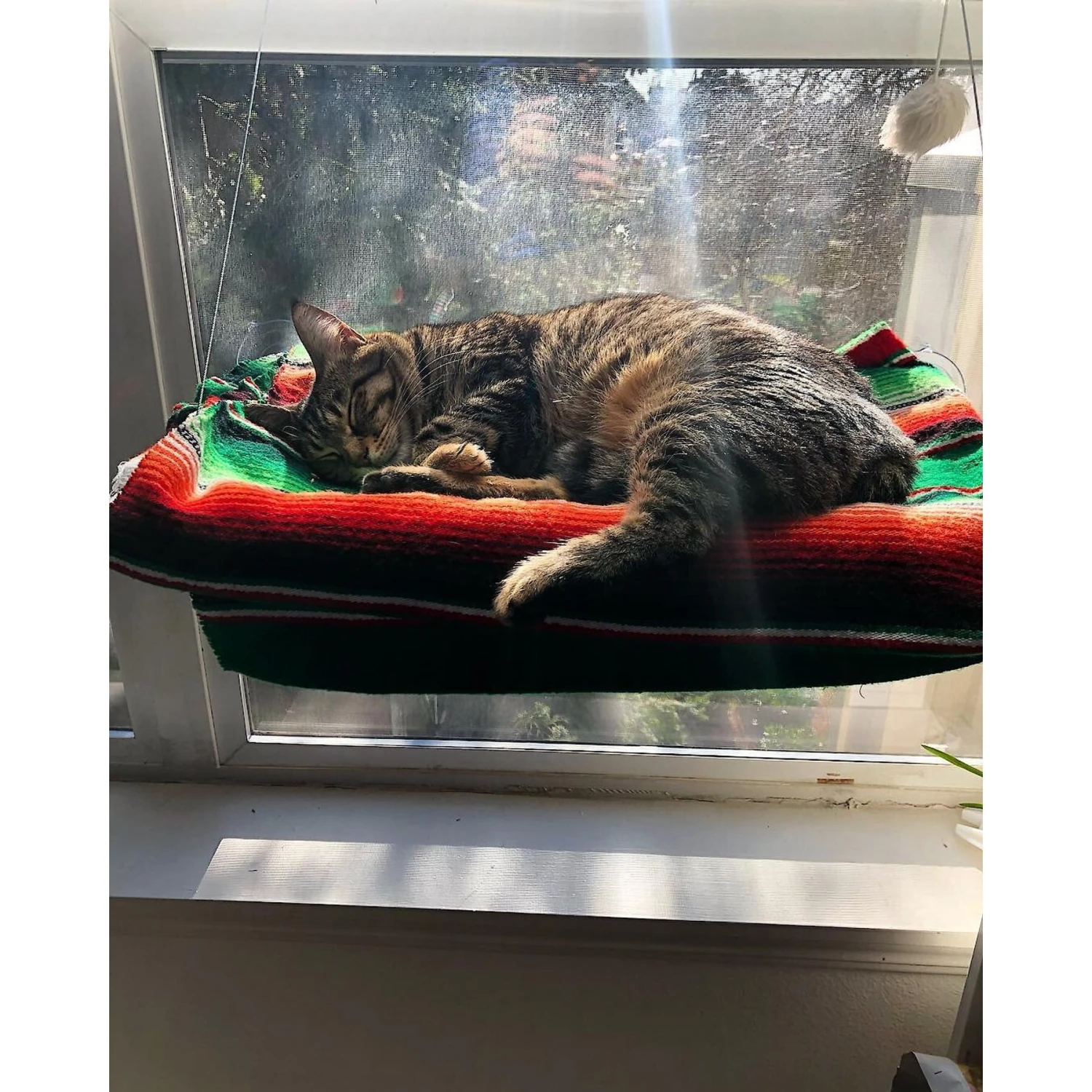 - The hammock is made of tough, weather-resistant fabric that’s easy to clean but also makes a comfy spot for catnaps.