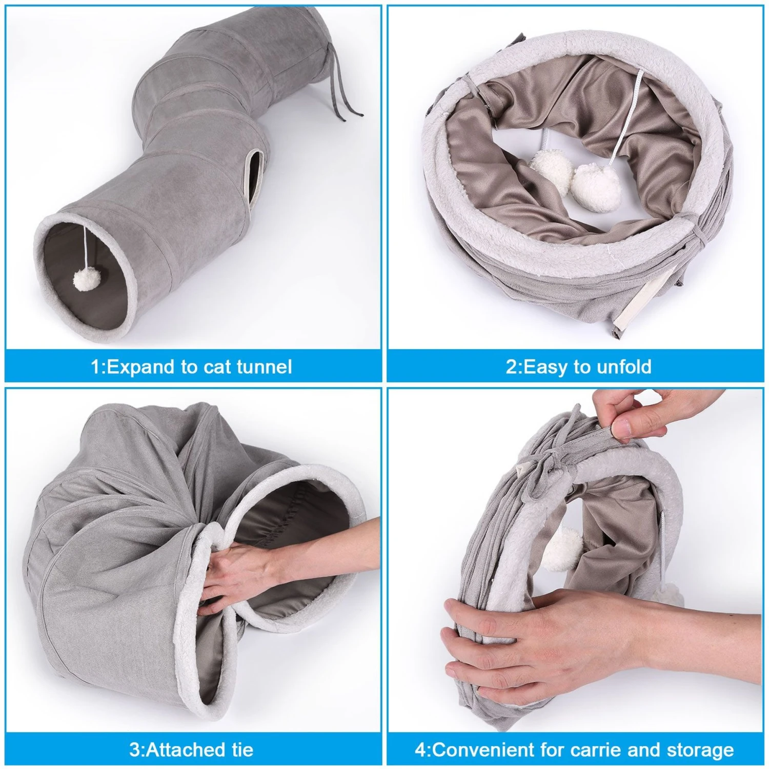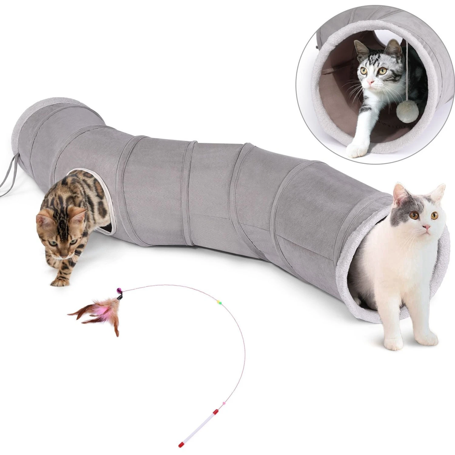 Give your feline fur-iend the purr-fect place to hide with the Ownpets S Shape Tunnel Cat Toy! This stylish tunnel is made from durable, oxford fabric in a neutral gray color, and its collapsible design allows you to use it at home or on-the-go. It features a unique S-curve design, peep holes, a drop ball in the middle of the channel and an additional feather wand for increased interaction. It’s also suitable for puppies, rabbits, weasels, marmots and other small pets. This multifaceted toy is sure to provide plenty of play paw-sibilities for you and your purring pal!