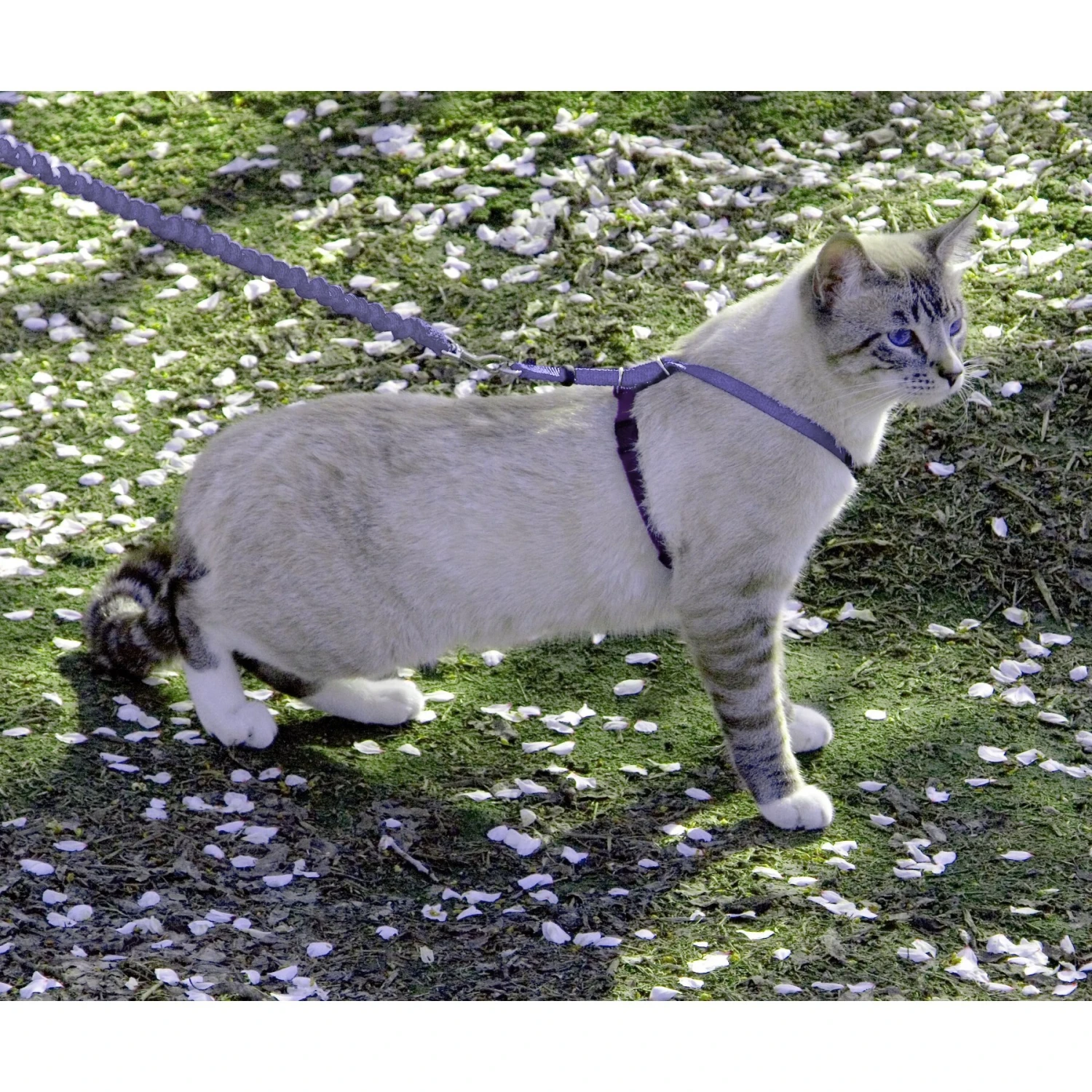 The Bungee leash provides gentle “give” when kitty pulls. The belly strap is made of a complementary-colored nylon, so you can quickly see which strap goes over the shoulders and which goes under the belly. Includes a detailed fitting/training guide.