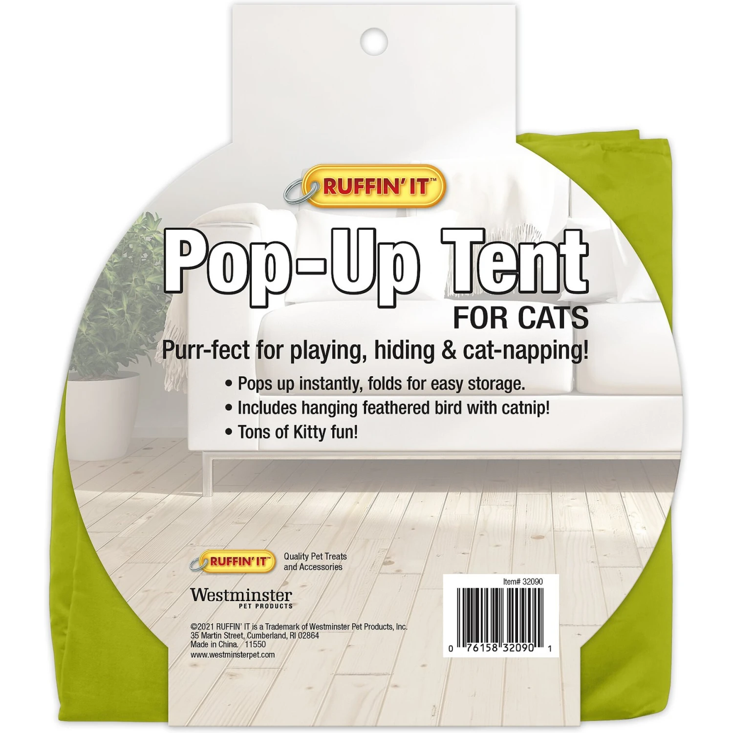 Does your kitty love to curl up and nap in her own secret spot? Then she’ll love a RUFFIN’ IT Cat Pop Up Tent Cat Toy. This cute pop-up home is specially designed for feline friends. Easy to use, this colorful tent is purr-fect for playing, hiding and hours and hours of cozy cat napping. Your kitty is also sure to enjoy the included dangling bird toy with catnip. Plus, the tent folds up for easy storage or travel, so you can bring it with you on the go.