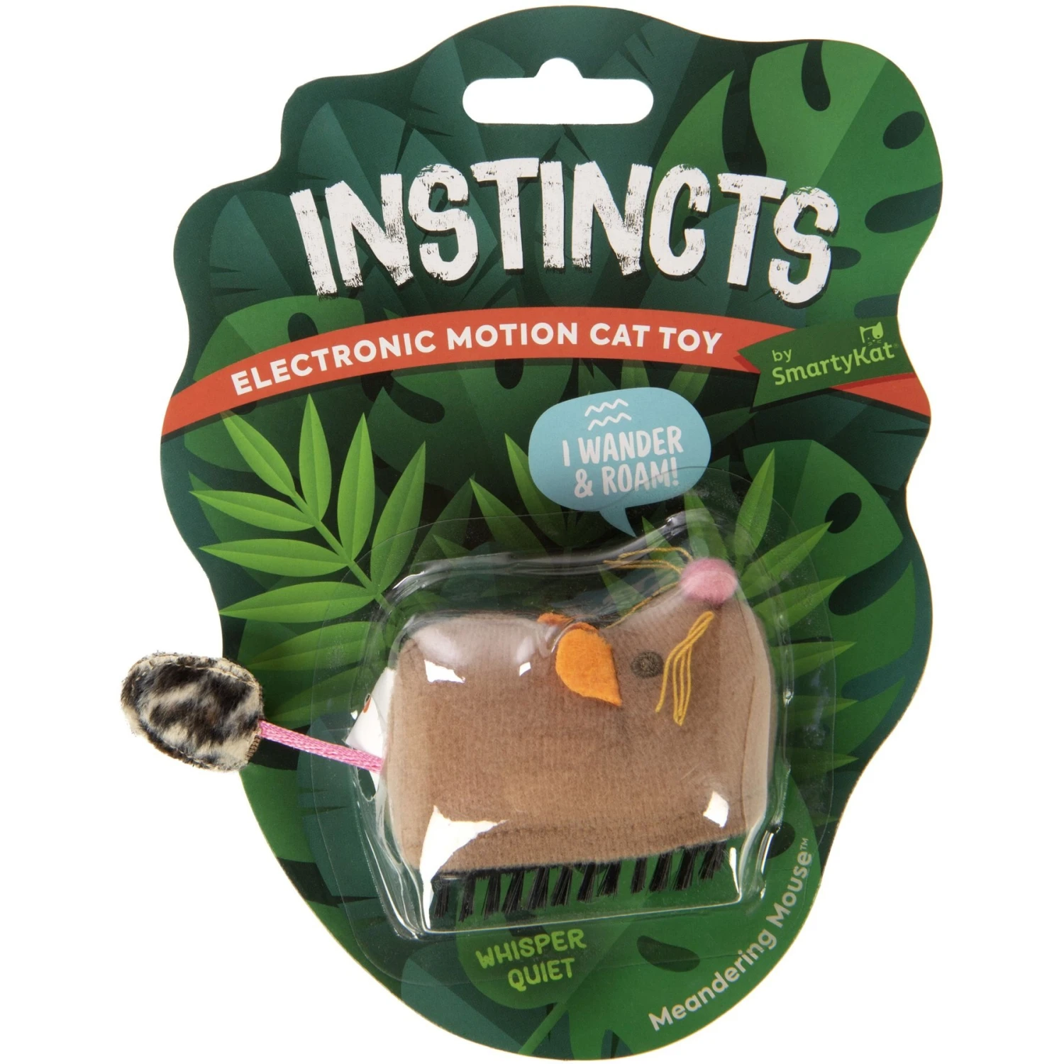 The Instincts by SmartyKat Meandering Mouse Motion Battery Powered Plush Cat Toy is made of a soft plush, so it’s purr-fect for swatting and pouncing. Its gentle roaming motions and dangling cord tail help to appeal to your kitty’s instincts to stalk, chase, swat and pounce. The toy wanders in circles and curves, and it moves gently to avoid startling your furbaby. The on/off switch helps to maximize battery life, and the fiberfill is made from recycled plastics, making this toy an environmentally friendly choice.