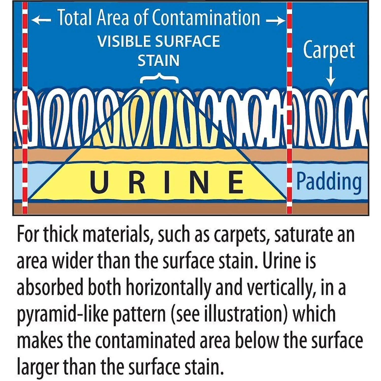 For thick materials, such as carpets, saturate an area wide than the surface stain. Urine is absorbed both horizontally and vertically, in a pyramid-like pattern, which makes the contaminated area below the surface larger than the surface stain. See illustration above.