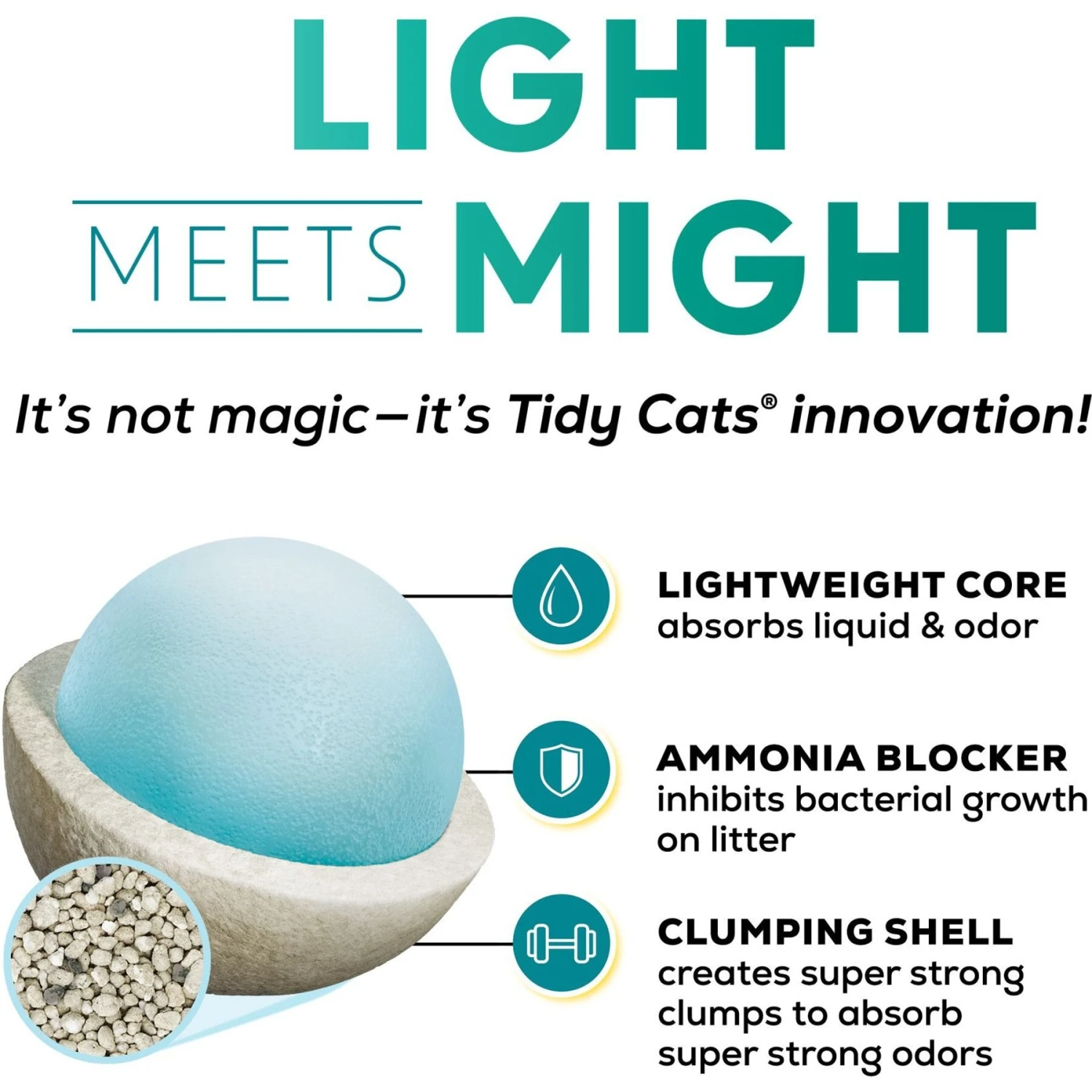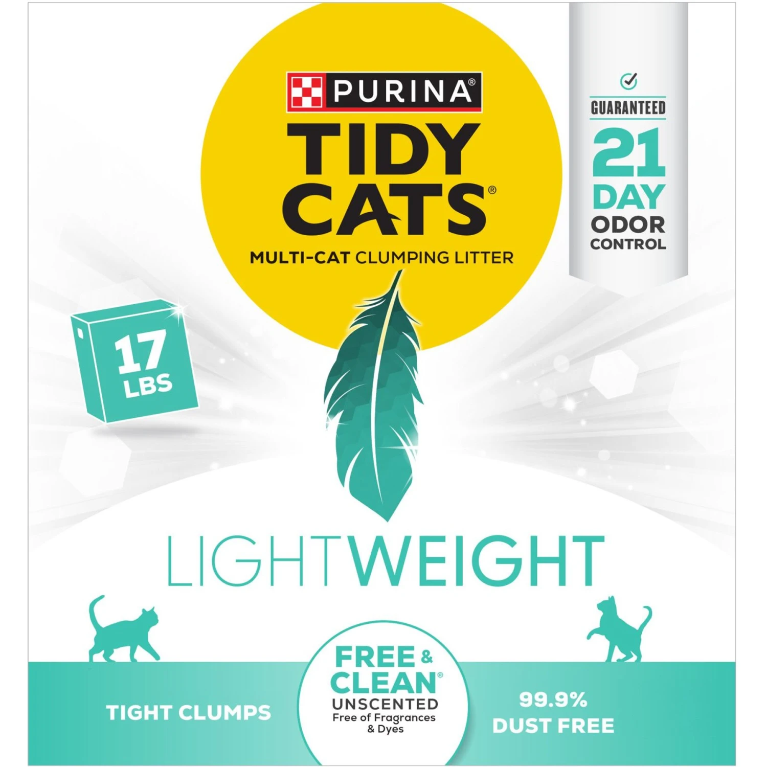 Win the war against litter smells with Purina Tidy Cats LightWeight Free & Clean Unscented With Ammonia Blocker Clumping Multi Cat Litter. This unscented cat litter steps up to meet the needs of both you and your feline friends. The lightweight cat litter has absolutely no fragrances or dyes, and it’s low dust to pour easily into the litter box. Activated charcoal in the clay cat litter absorbs odors on contact, while an Ammonia Blocker stops ammonia odor in its tracks for 14 days when used as directed. The odor control cat litter helps keep your home smelling fresh, and it helps lock in moisture, keeping your furry family comfy too. Weighing half as much as the leading clay clumping cat litter, Tidy Cats lightweight cat litter is also easy to carry, pour and store. Taking care of the litter box is a snap when you use this unscented lightweight cat litter for your whole cat family. It’s made by Tidy Cats, the brand most often recommended and personally used by veterinarians.