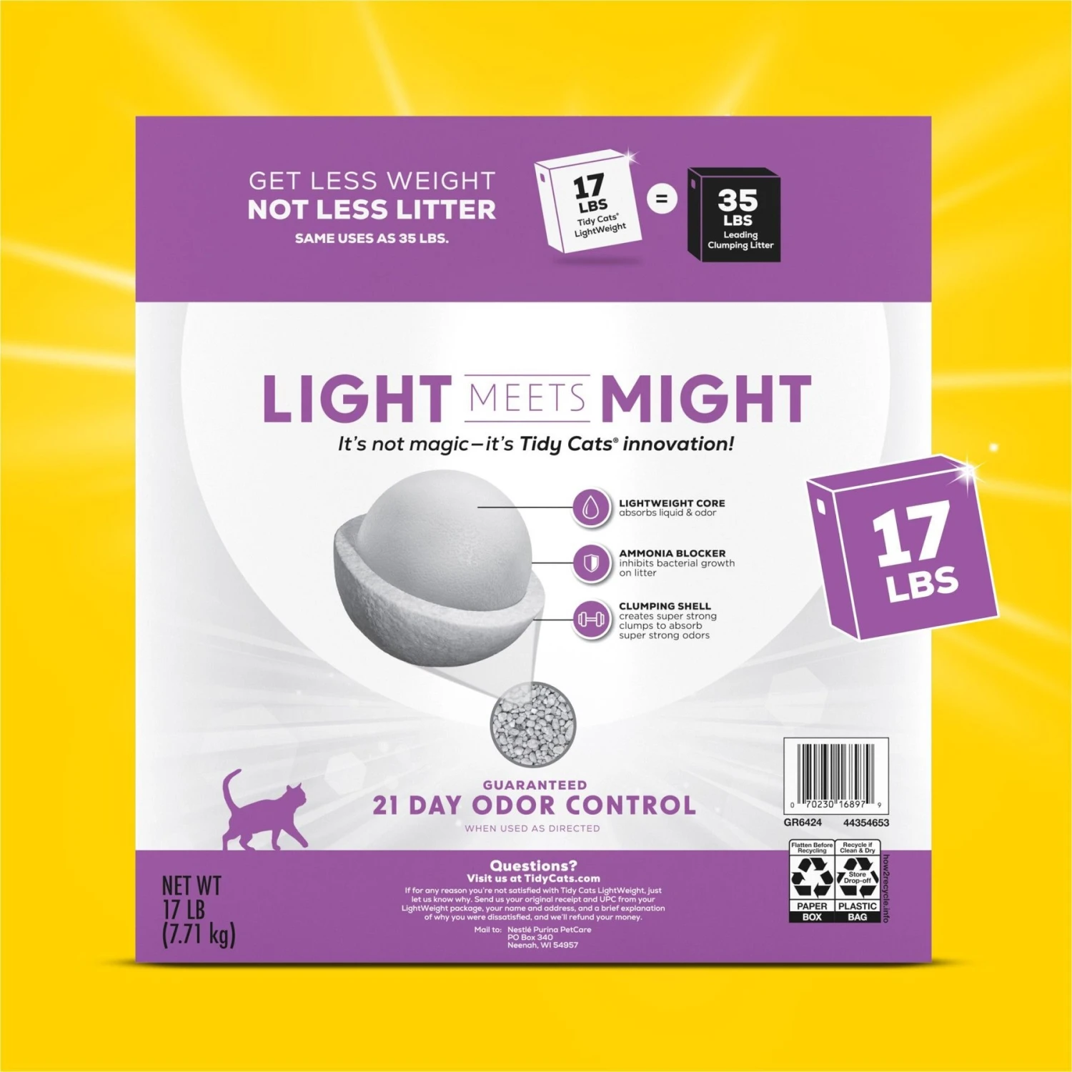 Bring a touch of springtime indoors with Purina Tidy Cats LightWeight With Glade Clean Blossoms Clumping Multi Cat Litter. This lightweight cat litter stops ammonia, urine and fecal odors in their tracks, keeping each litter box smelling nice. A powerful Ammonia Blocker prevents ammonia odor from forming for 14 days when used as directed. Even better, the scented cat litter leaves behind a fresh fragrance and makes litter care a snap! At less weight than leading clumping cat litter, this lightweight litter is easy to carry, pour and store. It forms strong, tight clumps for easy scooping, and the low dust clumping cat litter pours cleanly into the cat box. This odor control cat litter with Glade Clean Blossoms stands up to regular use by all your feline family members and wows with moisture-locking technology that keeps them dry and comfy. With this powerful odor control clay cat litter, you can get back to the important stuff—spending more fun time with your favorite felines.