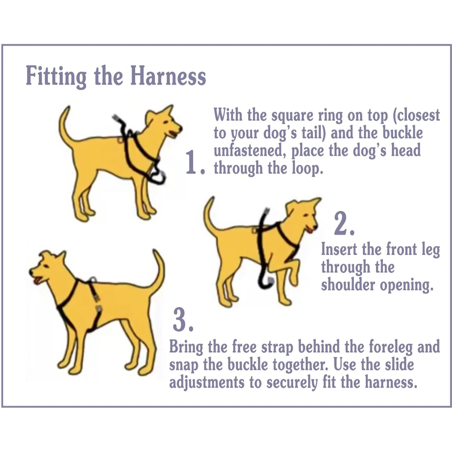 INSTRUCTIONS: 1. With the D-ring on top (closest to your dog’s tail) and the buckle unfastened, place the dog’s head through the loop. 2. Insert the front leg through the shoulder opening. 3. Bring the free strap behind the foreleg and snap the buckle together. Use the slide adjustments to securely fit the harness. CARE: Please use during times of activity and remove at night or when you leave your pet unattended. Keep brace clean by hand washing and hang drying.