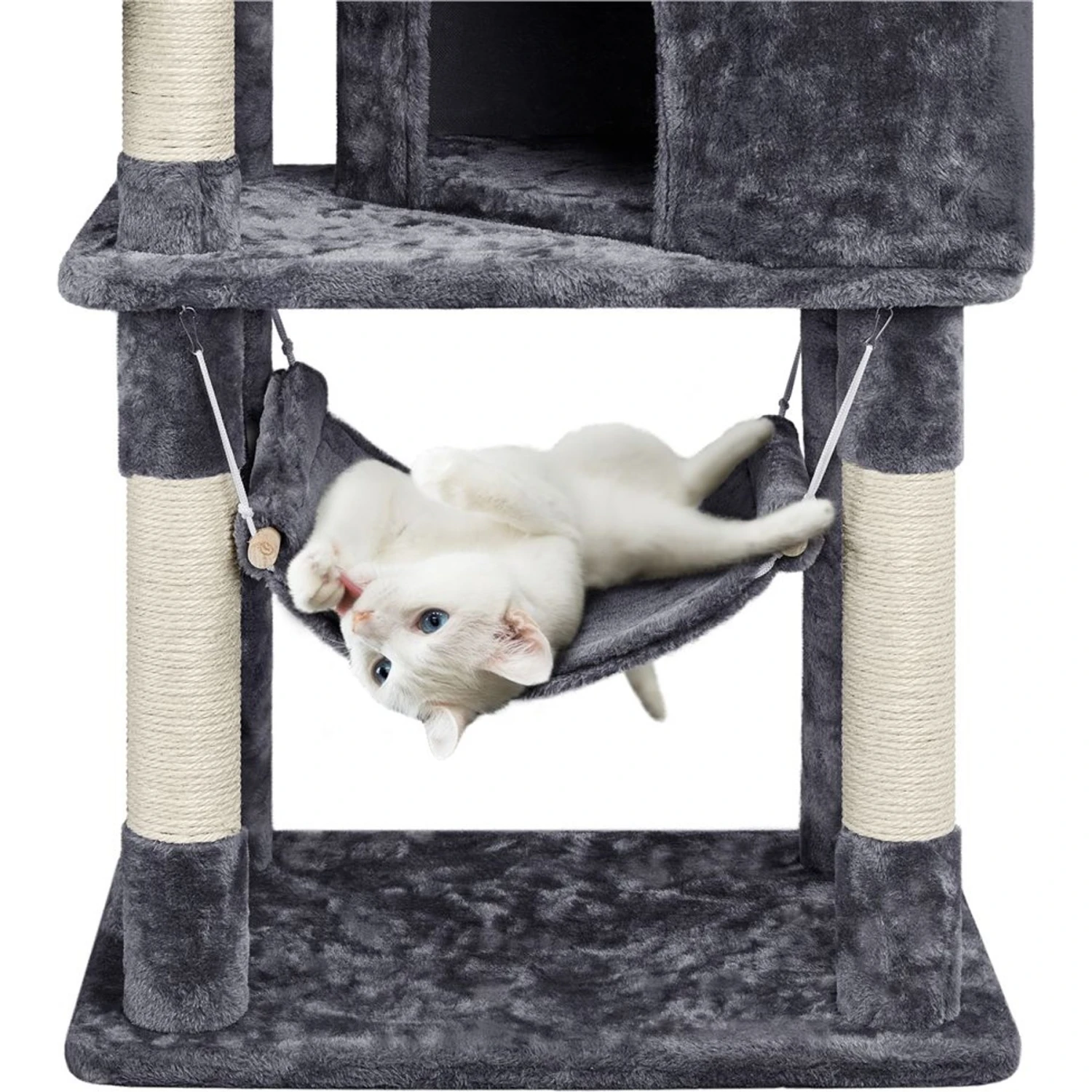 Give your feline friends a fantastic place to frolic with Yaheetech 3-Level Plush Cat Tree. Constructed of solid boards and connected with durable metal accessories, this sturdy cat tree is covered with a comfortable soft plush your kitty will love. With five sisal rope-bound poles, a roomy condo, three levels of spacious platforms, a hammock and a basket cradle, this exciting cat tree is bound to captivate even the most finicky of felines! With rounded edges to help prevent scrapes and bumps during jumps, it features a secure anti-topple strap on the middle platform to keep it in place even during rough play. Ideal for two average-sized cats or two to three kittens, it’s the kitty castle your furry friends have always wanted!